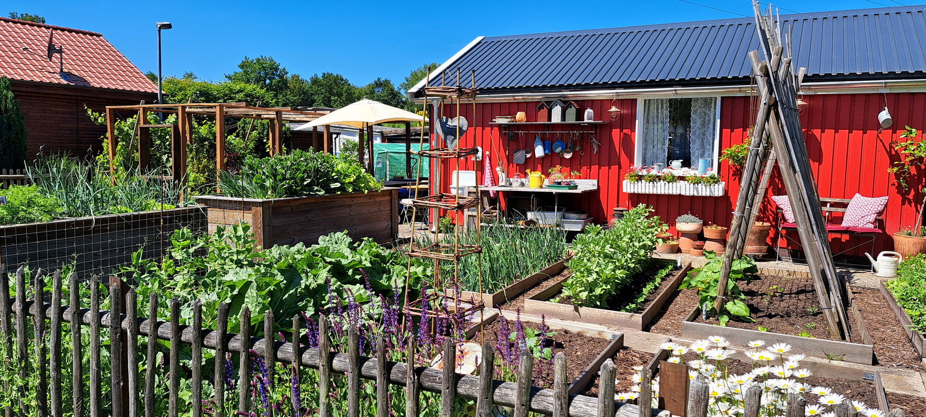 Gartenlaube, Geräteschuppen, Gartengeräte, Werkzeuge, Stromanschluss sowie ein Grundwasserbrunnen vorhanden.